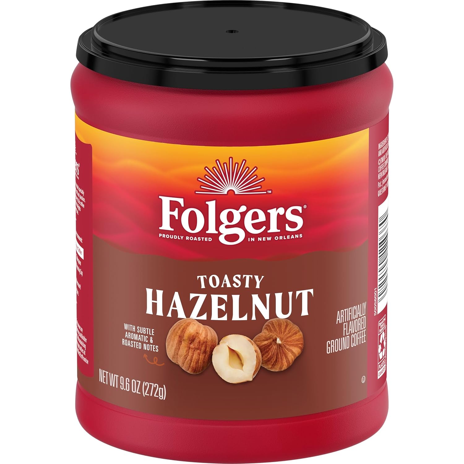 - Contains six (6) 9.6 oz. canister of Folgers Toasty Hazelnut artificially flavored coffee